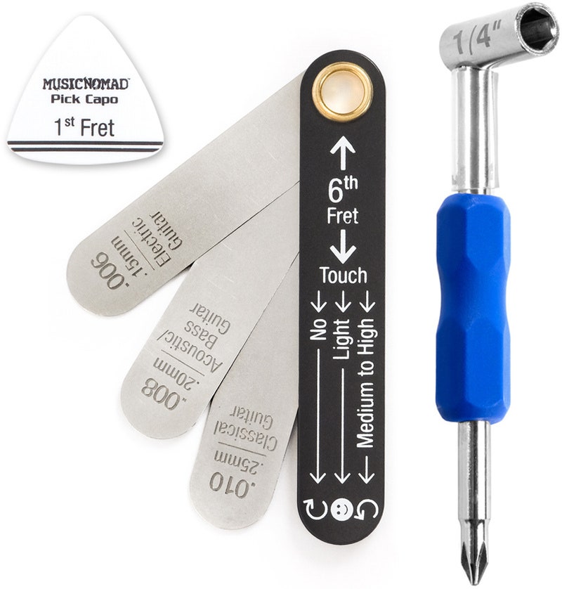 För att enkelt justera halsen på din TAYLOR® eller andra instrument med 1/4" dragstångshuvud så har MusicNomad tagit fram ett set med dragstångsnyckel och måttsats. Måttsatsen kommer med de vanligaste relief-måtten för elektriska, akustiska gitarr samt även för elbasar, för just Taylor rekommenderas generellt måttet .008". Dragstångsnyckeln är konstruerad att passa de TAYLOR® instrument där halsen justeras vid huvudet, i andra änden av dragstångsnyckeln hittar man en praktisk magnetisk stjärnskruvmejsel. Perfekt när man tar bort dragstångsluckan.