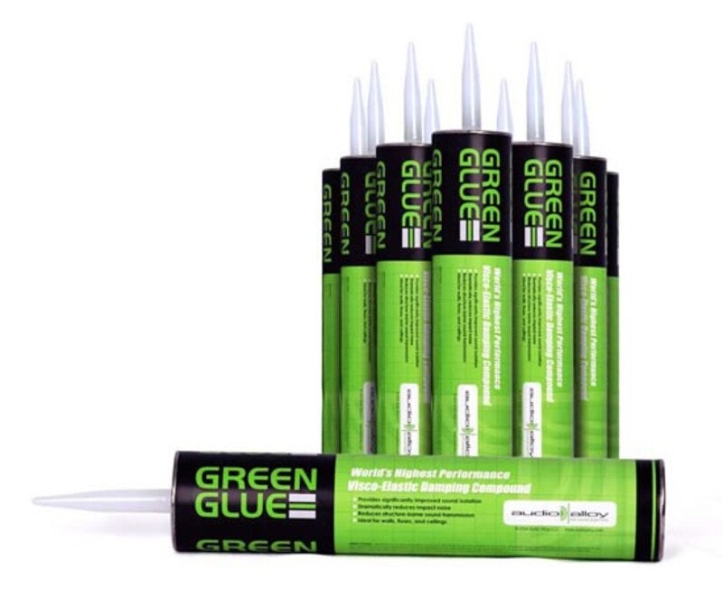Greenglue är ett ljudisolerande lim/fog som du sätter på gipsskivor och annat material för att stoppa att ljudvågor tar sig ut eller stutsar. Greenglue kan förebygga att ljud tar sig förbi genom att transformera ljudvågor till värme.
