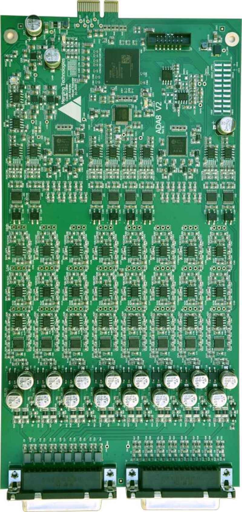 The ADA8P is a complex input and output card for the Merging audio mainframes Hapi and Horus. With eight inputs and eight outputs, it offers two-way audio conversion: analog to digital and digital to analog.