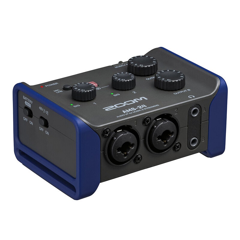 The AMS-24 is perfect for solo streams and multi-instrument sessions. It features two XLR/TRS combo inputs along with Zoom’s low-noise preamps. Also included are two headphone outputs and two TRS outputs for external monitors.