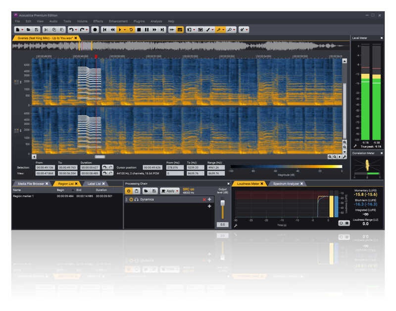 The Premium Edition adds advanced features such as spectral editing with powerful retouch algorithms and multi-channel support up to 7.1 surround. A large collection of plug-ins are included and seamlessly integrated into the application. With the Premium Edition, you can also use these in other host applications supporting VST, VST3, AAX or Audio Units (Mac only):