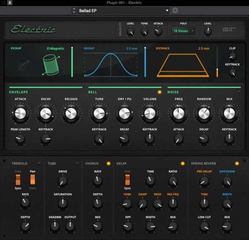 - Dedicated Pickup, Envelope, Bell and Noise parameter sections provide a huge amount of flexibility to configure the timbre of the electric piano sound.