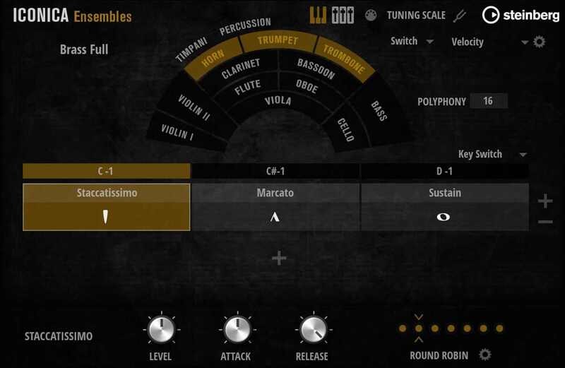 - Contains pre-configured ensemble sections for strings, woodwinds, brass and percussion