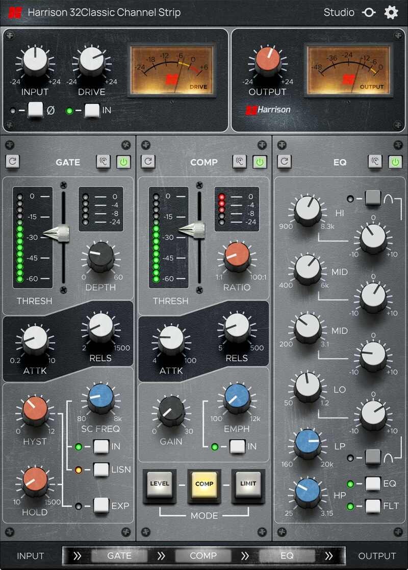 Artikelnummer 1072479A fully featured channel strip complete with four - band parametric EQ, High Pass and Low Pass filters, transformer saturation with ‘ Drive ’ control, Compressor and Gate/Expander – everything you need t o make music with the classic Harrison sound