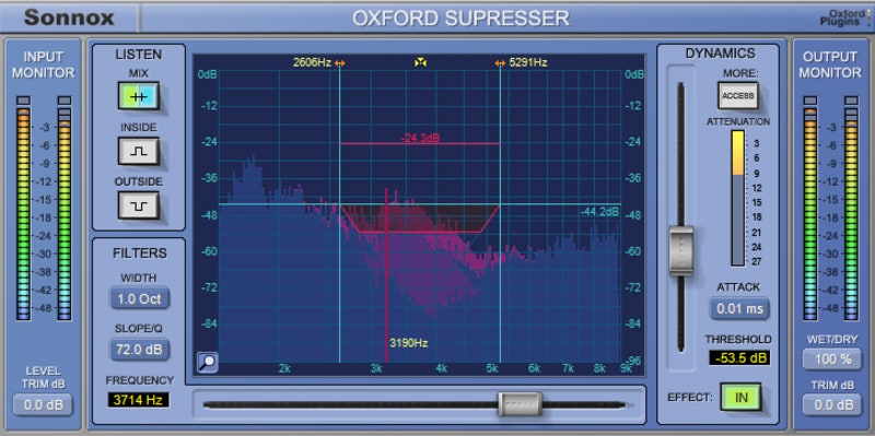 Artikelnummer 1018268The Oxford SuprEsser is both a very highly-featured professional De-Esser and a Dynamic EQ. There is a simple mode for quick fixes, but also an advanced mode for increased functionality and fine-tuning. The combination of an intuitive FFT display and three listen modes enables the user to easily see and hear exactly where the problem frequencies are, allowing the rapid reduction or removal of the offending audio. As well as being able to trigger the full band compression, only the offending frequencies can be carefully carved out. Since the SuprEsser can operate at all frequencies, ‘plosives’ and other annoyances can also be removed effortlessly, making it more than a simple De-Esser. Additional features include Automatic Level Tracking, Linear Phase Filtering and a Wet/Dry blend control for final balancing.