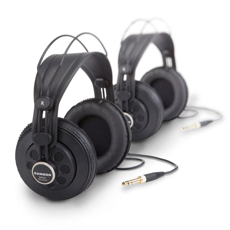 Samson's SR850 är ett par professionella referenshörlurar. Med en semiöppen design och 50mm drivers ger SR850 bra återgivning av hela frekvensregistret: djup bas och klar diskant. Självjusterade headband.