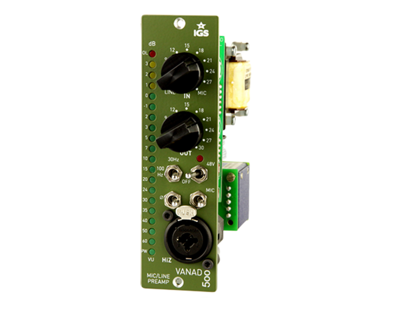 VANAD 500 is a mic/instrument preamp designed in the API 500 standard. The module is transformer balanced on inputs and outputs using Carnhill transformers. All regulators on the front panel are stepped switches. Excellent for recording any sources, including line signals from instruments like guitars or keyboards (Hi-Z input at the front of the unit).