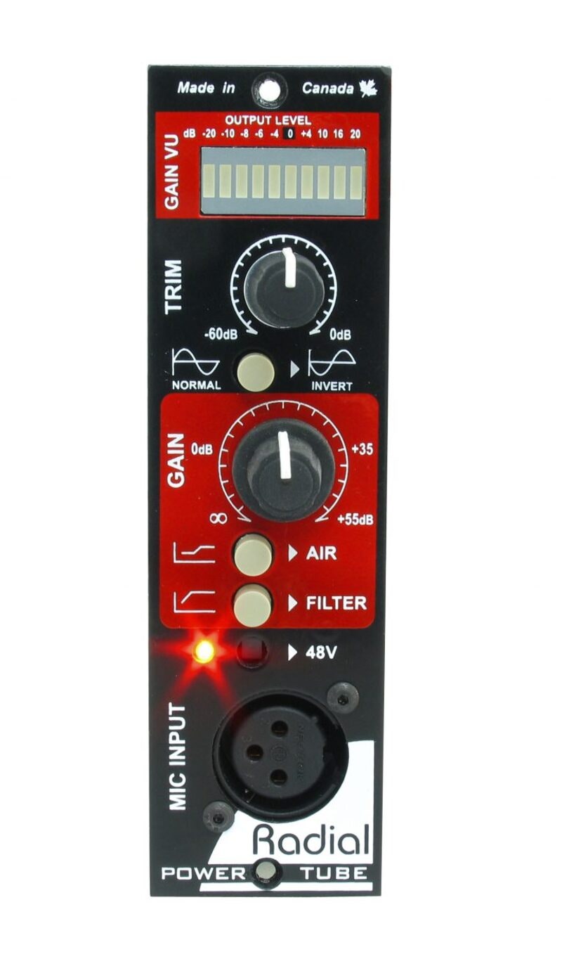 The Radial Powertube is 500 series 100% discrete class-A preamp with high voltage 12AX7 tube gain stage and transformer coupled input for vintage character.