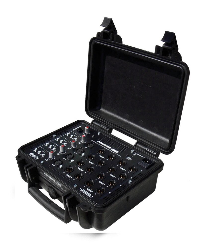 Kickbox 4x4 är en 4-kanals aktiv splittbox med 4 mic/line in och 16 ut. Den höga ljudkvalitén, robusta och bärbara konstruktionen gör den till ett idealiskt verktyg då fler utgångar behövs vid t.ex. liveframträdanden, radiosändningar i fält, sportevenemang, presskonferenser m.m. Den innehåller fyra mic/linje förförstärkare av studio-kvalité, var och en med upp till 66dB gain, stegat, och 16 balanserade utgångar. Kan konfigureras i olika kombinationer allt mellan 4in / 4ut till 1in / 16ut. Leveras i en hållbar väska med avtagbart lock. KickBox 4x4 kan även specialbeställas med transformator-isolerade utgångar.