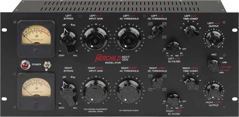Like its vintage inspiration, the Heritage Audio Herchild 670N works differently from most other compressors. Dating back to the early 1950s, the original design addressed the need for effective level control in vinyl disc mastering. The stereo long-playing record was becoming established and existed alongside monaural LPs. Being that stereo disc grooves stored twice the amount of information as those of a mono LP, dynamic shaping of the program material was essential (as was stereo/mono compatibility). The 670, placed in front of a cutting lathe, gave the mastering engineer precise control over the depth and the width of the grooves in order to maintain sufficient program length and level for an LP to be competitive with other commercial releases. Like the original, the Herchild 670N features LAT VERT and LAT VERT LINK modes. If you’ve discovered the advantages of mixing and mastering with mid-side (M-S) processing, LAT VERT gives you mid-side functionality for mixes with increased width, depth, and focus. LAT VERT LINK does the same, but with the two channels linked.