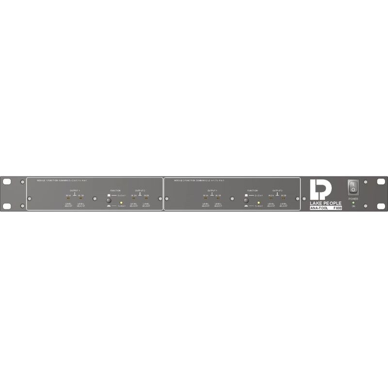 Lake People F833 är en analog summerings- och omkopplingsenhet som hanterar signalväxling mellan flera ljudkällor och målenheter. Den är utvecklad för användning i studiosammanhang, liveljud och sändningsmiljöer där exakt kontroll över signalflödet krävs.