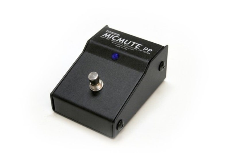 The Micmute PP are configured as latching Push On; Push Off switch, meaning that the switch must be pushed and released to turn the signal on or off through the box. Each time the switch is pressed and released (PP), the signal is changed from one condition to the other. The PP have an indicator LED feature that is operational when the connected microphone preamp input is providing phantom power. The blue LED illuminates to indicate that the mic is live and signal is passing through the Micmute box. The LED is not functional when phantom power is not present.