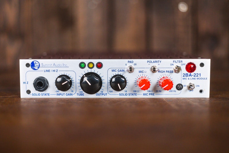 Summit Audio 2BA-221 är en förförstärkare som kombinerar rör- och transistorteknik med separata signalvägar och komponenter av hög kvalitet. En dedikerad strömkälla driver 48 V fantommatning utan att påverka huvudkretsarna.