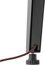 Kabeldragningen löses genom ett integrerat system under bordsskivan, och de avtagbara innerpanelerna i benen förenklar routing mellan instrument, ljudkort och strömförsörjning. De justerbara fötterna hjälper till att hålla bordet stabilt även på ojämna golv – något som ofta förekommer i hemmastudios och repmiljöer.