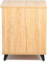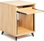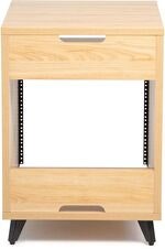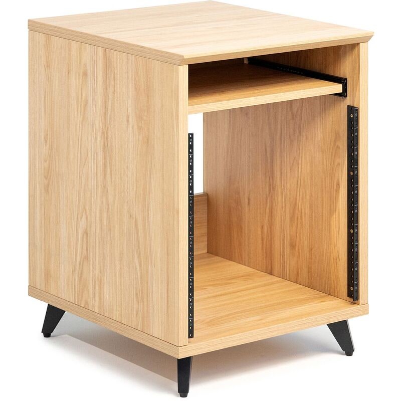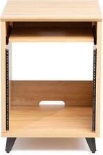 Artikelnummer 1097289Studiobord med 10U rack, matte maple-finish, utdragbar hylla med 16 kg kapacitet, kabelgenomföring, justerbara nivåfötter och 610 x 535 mm arbetsyta