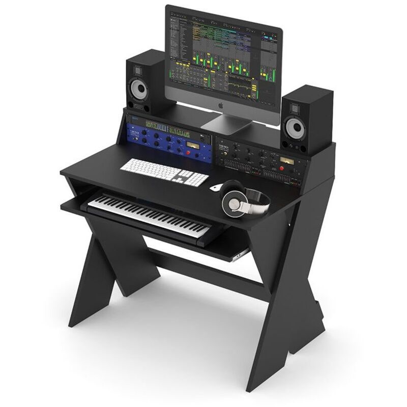 Den rymliga arbetsytan rymmer laptop, skärm, ljudkort, kontroller och synthesizers, medan två integrerade 3U rack ger plats för 19” studioutrustning inom bekvämt räckhåll. På den utdragbara klaviaturhyllan får tangentbord med upp till 61 tangenter plats, och den kan monteras i sex olika höjder för optimal ergonomi.