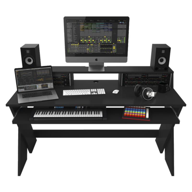 - Offers enough space to set up laptop/computer, screen, studio monitors, audio interface, 19” rack mount equipment, MIDI controllers, synths and a master keyboard