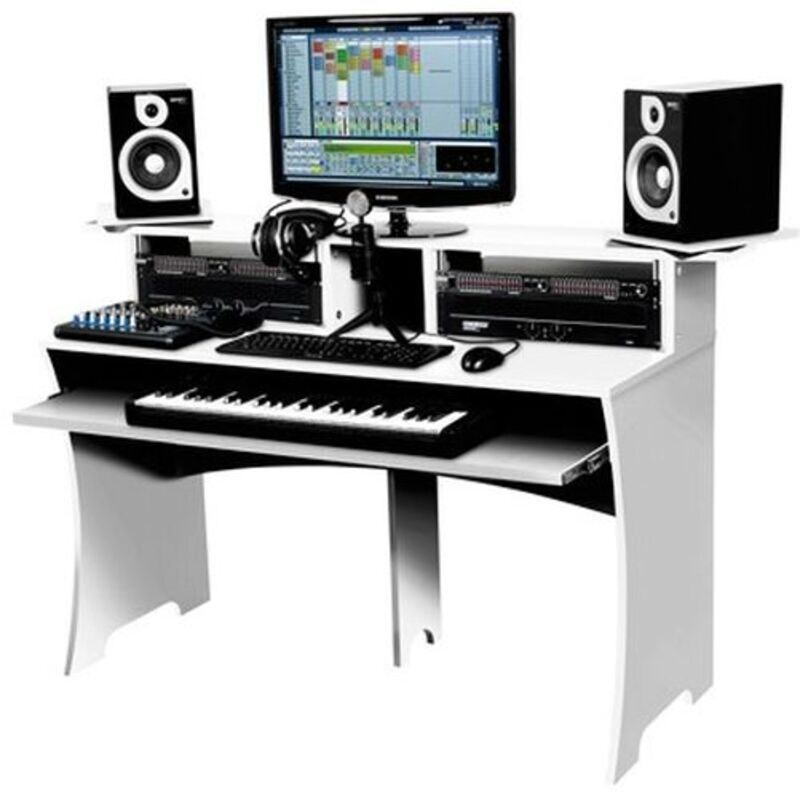 Artikelnummer 1094443Studiobänk, vit, robust MDF-konstruktion, utdragbar klaviaturhylla, 2x 4U rack, roterbara monitorhyllor, mått 1520x951x550 mm, vikt 43 kg.