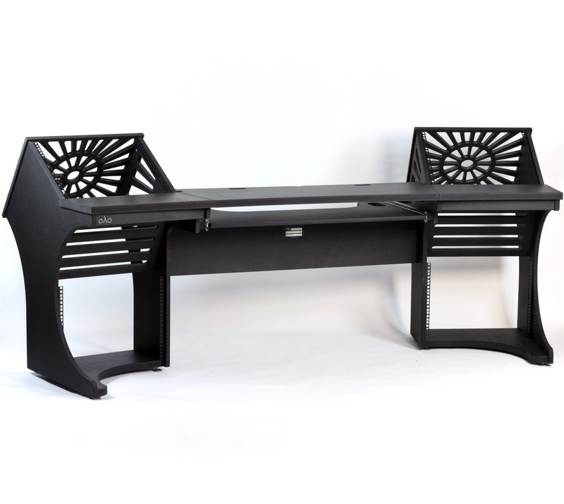 Artikelnummer 1090471Studiobord med minimal akustisk påverkan, 2x8U 15º vinklade rackutrymmen, utdragbar hylla, plats för 2st 25" skärmar, justerbara fötter, tillverkad i Sverige