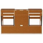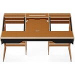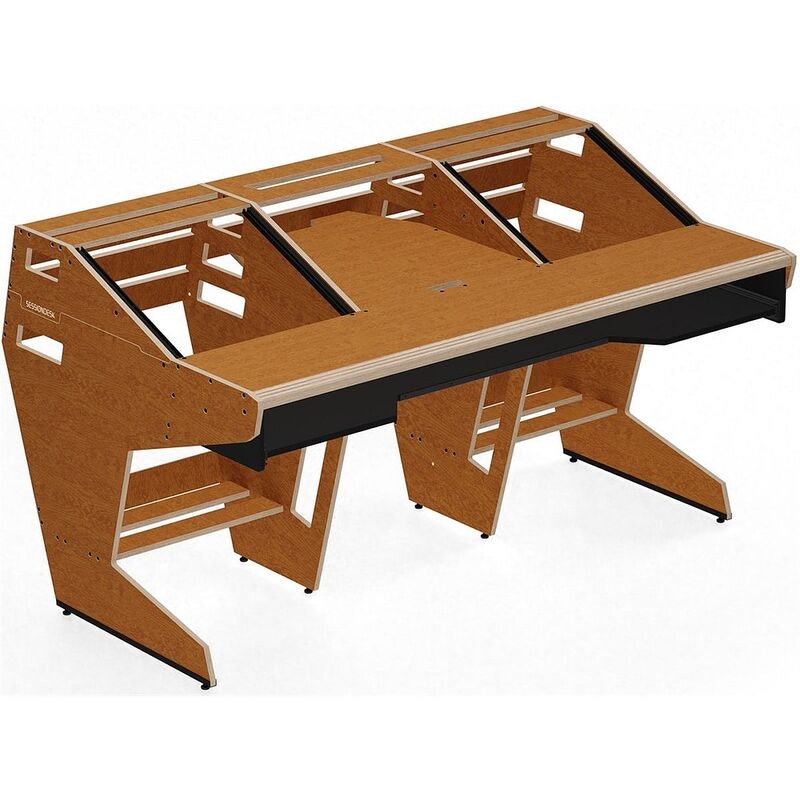 Artikelnummer 1095550Studiobord, 2×9U rackutrymme, integrerad keyboard drawer, björkplywood, justerbar mittsektion, monitorplattformar, avancerad kabelhantering, 60s Brown-finish