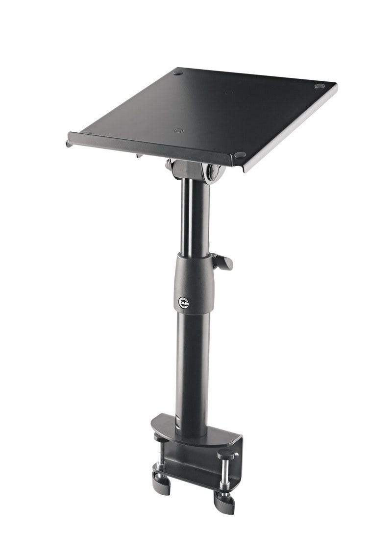 Height-adjustable monitor stand with table clamp for near-field monitors. The solid metal construction with the large support plate (230 x 250 mm) is suitable for a wide range of monitors and other equipment in this size range. The plate can be tilted continuously up to 12.5° and moved to optimise the centre of gravity. A stop bar ensures the necessary safety and prevents the monitor from slipping. The practical table clamp enables attachment to tabletops with a thickness of 10 to 52 mm. The individual height can be adjusted in 4 steps between 335 and 435 mm. In terms of load capacity, a centric load of up to 25 kg is possible. The support plate can be rotated 360° for perfect alignment. Rubber pads are included for secure, noise-insulating support of the monitors.