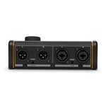 Inputs: 2x balanced line-in via XLR/TRS combo sockets and 1x unbalanced line-in via 3.5 mm TRS. Outputs: 2x balanced line-out via 3-pin XLR and 1x unbalanced line-out via 3.5 mm TRS.