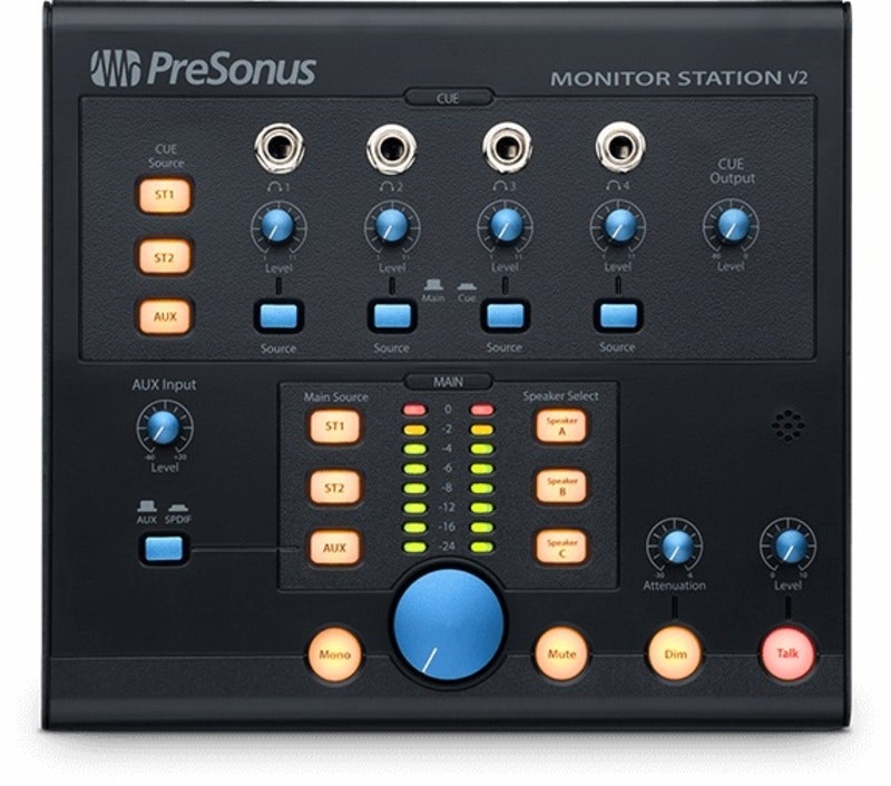 - Cue-sektion med Source select (ST1, ST2, Aux) och kontroll för utnivå
