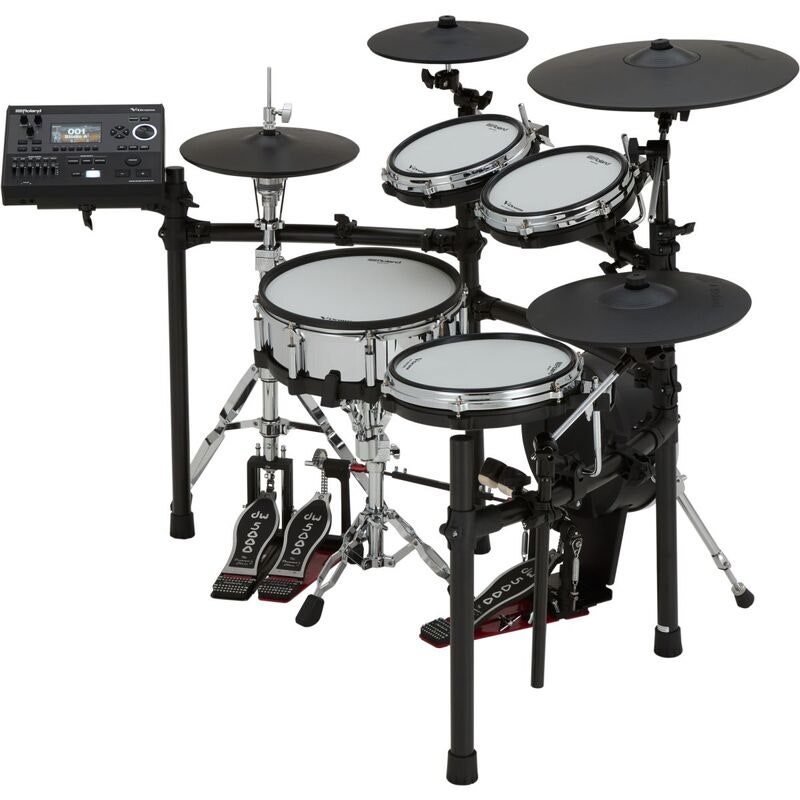 V51-ljudmodulen står i centrum och drivs av samma motor som flaggskeppsmodellen V71. Den ger tillgång till realistiska trumljud och avancerade anpassningsmöjligheter. Virveltrumman PD-140DS är digital med positionsavkänning och cross stick-funktion. Tompads PD-10P och PD-12P har kromad sarg och trippelsensorteknik som ger jämn respons och eliminerar hotspots. Bastrumman KD-12 har 7,5-tums spelyta och förstärkt konstruktion för stabilitet.