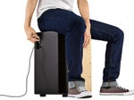 Subwoofer Pickup Cajon med kropp/sidor utav svart ecovänlig fiberboard, frontplatta i björk med unika ljudhål/port vid sidan utav cajonen istället för det traditionella ljudhållet på baksidan av cajonen.