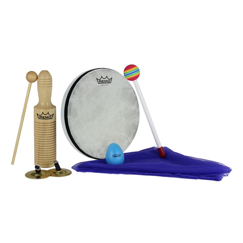 - Includes a Hand Drum and mallet, Tone Block, Finger Cymbals, Shaker Egg and Purple Scarf