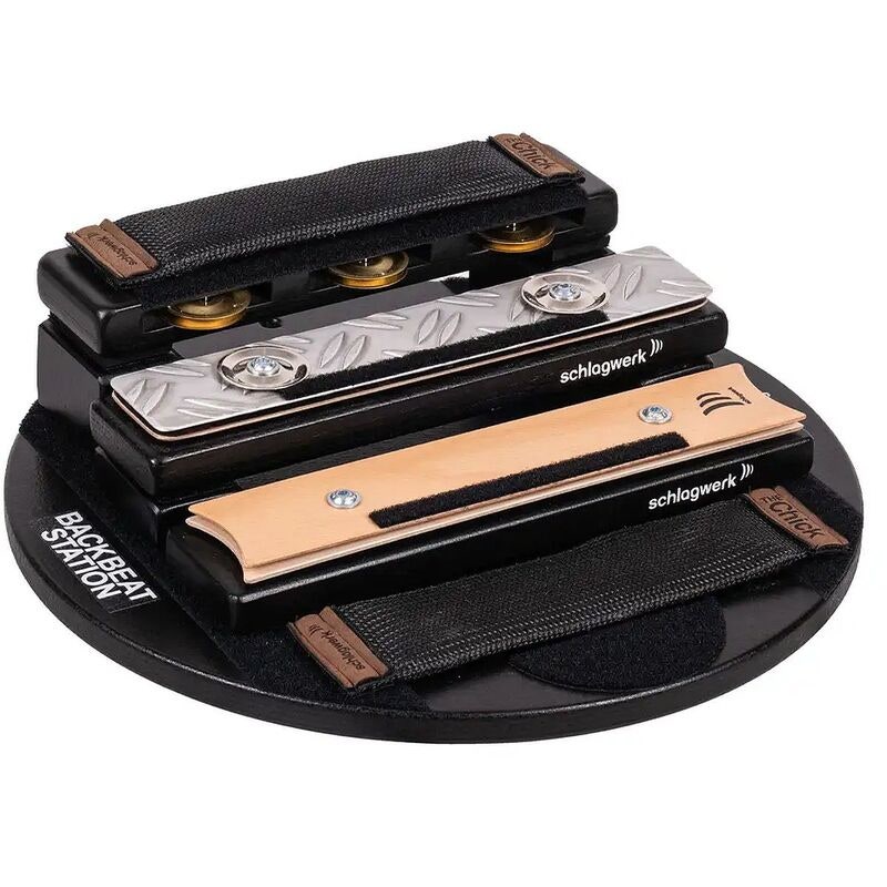 Schlagwerk Backbeat Station Pro är en modulär effektplattform som adderar nya, kreativa backbeat-ljud till ett akustiskt trumset. Konstruktionen bygger på en rund basplatta med 350 mm diameter i björkplywood, där olika effekter kan placeras, flyttas och kombineras efter behov.