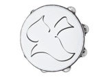 Tamburin med syntetskinn med duvmotiv. Förstämt skinn och ståljinglar ger denna tamburin en ljus ton och mycket volym. Lätt kropp som ger spelglädje.
