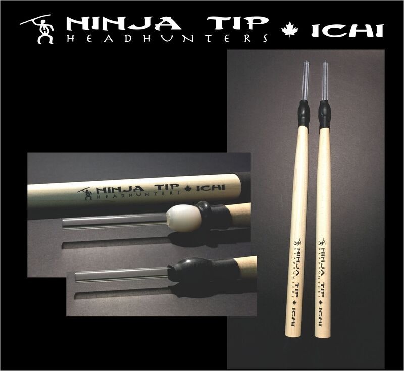 Ninja Tips are available in two different models, the Ichi and the Ni. Both models are based on a nylon tip maple drum stick platform with a polycarbonate rod. The tip has been drilled through the centre, a small amount of epoxy is inserted into the hole and then a polycarbonate rod is pressure fitted into the centre. Thin surgical tubing is placed over the nylon tip area. The Ichi is like a 5B weight and diameter and the Ni is similar to a 2B weight and diameter.
