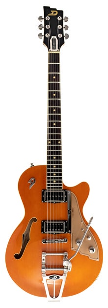 Elgitarr, semi-hollow, flammad lönnkropp, lönnhals i medium "D"-profil, grantopp, greppbräda i indisk...