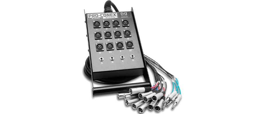 12 punkts patchbay med balanserade XLR, hona på framsidan och hane på baksida (kan ändras).