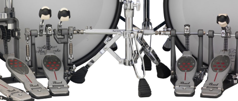 Dubbel bastrumpedal med dubbel kedjedrivning, tvåsidigt slaghuvud samt uni-lock