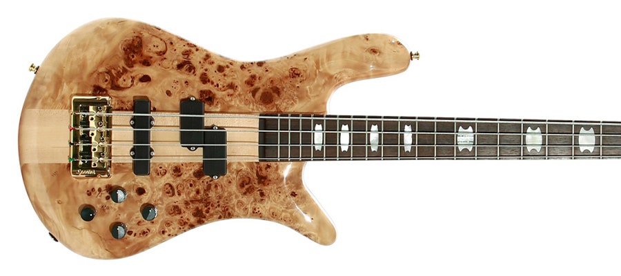 Elbas, kropp i ask med poppeltopp, genomgående lönnhals, ebenholtz greppbräda, EMG pickuper, Darkglass Spector...